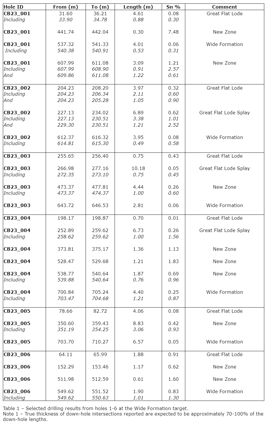The continuing drill program also intersected multiple steeply dipping, high-grade tin zones, mainly located between the Great Flat lode and the Wide formation (see the table entitled "Selected drilling results from holes one to six at the Wide formation target"). More work is required to determine the orientation and true thickness of these zones. Identifying areas where these structures intersect both the Great Flat lode and the Wide formation is of particular interest, as these intersection points represent areas of greater fracturing and potential for high-grade tin mineralization.