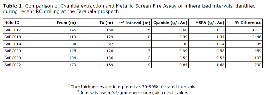 Six RC drill holes (1,036 m) were drilled in early March at the Tarabala prospect to test the down-dip extension of mineralization previously identified by near-surface drilling. The one m sample intervals were analyzed for gold using cyanide-leach (LeachWELL) analysis and the results reported in a Compass press release on April 18, 2023. The analysis identified a wide zone of gold mineralization (greater than 10 m) in five of the six holes. The widest intercept was 19 m at 0.84 gram per tonne (g/t) gold Au (from 170 m, SARC022), and the highest grade was 13 m at 3.3 g/t Au (from 84 m, SARC019), which included one m at 18.9 g/t Au (from 86 m). The presence of high-grade gold samples in fresh rock is indicative of coarse-grained (nuggety) gold. To investigate the presence of nuggety gold, duplicate sample intervals were analyzed using the metallic screen fire assay (MSFA) technique, which uses different crushed and sieved fractions to determine the presence of coarse-grained gold. The results of the metallic screens are shown in the table entitled "Comparison of cyanide extraction and metallic screen fire assay of mineralized intervals identified during recent RC drilling at the Tarabala prospect."