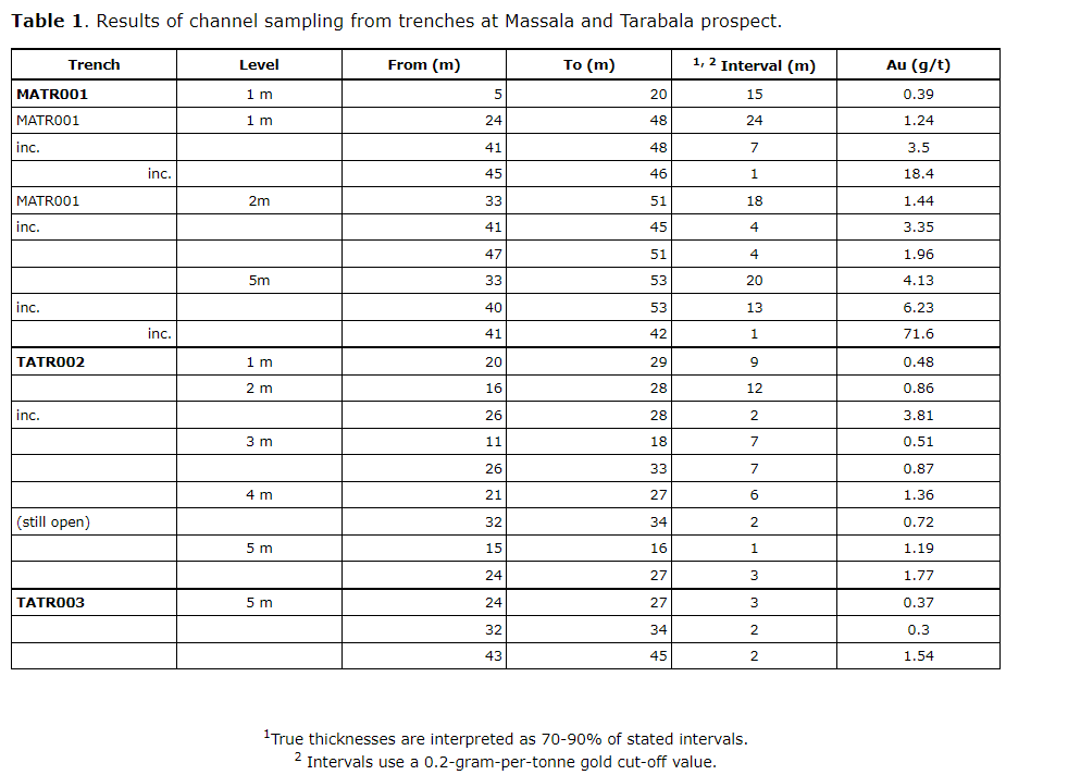 - Best interval from Massala: 20 m at 4.13 grams per tonne, including four m at 19.19 g/t Au (five m depth);