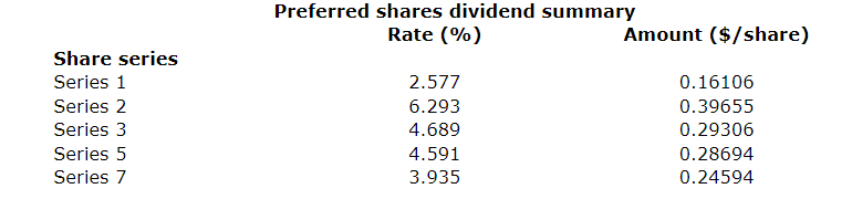 The board of directors has declared a quarterly base dividend of 14 cents per common share, payable on Sept. 29, 2023, to shareholders of record as of Sept. 15, 2023. In addition, the board has declared a quarterly dividend on each of the cumulative redeemable first preferred shares -- Series 1, Series 2, Series 3, Series 5 and Series 7 -- payable on Oct. 3, 2023, to shareholders of record as of Sept. 15, 2023, as noted herein.