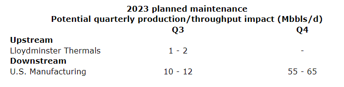 The attached table provides details on planned maintenance activities at Cenovus assets through the remainder of 2023 and anticipated production or throughput impacts.