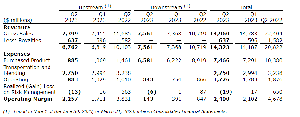 Second quarter cash from operating activities, which includes changes in non-cash working capital, was nearly $2-billion, compared with cash used in operating activities of $286-million in the first quarter of 2023. Adjusted funds flow was $1.9-billion, compared with $1.4-billion in the prior period, and free funds flow increased to $897-million from $294-million in the first quarter. Second quarter financial results improved compared with the first quarter, primarily due to higher price realizations in the oil sands segment, driven by narrower light-heavy crude oil differentials and lower condensate prices. In addition, oil sands segment sales volumes outpaced production by approximately 4,000 boe/d as the company drew down product inventory built through the first quarter of 2023 and fourth quarter of 2022. These factors were partially offset by higher operating costs in the U.S. manufacturing segment related to the commissioning and start-up of the Superior and Toledo refineries, as well as planned and unplanned maintenance at Borger. Results in the U.S. manufacturing segment were lower by approximately $170-million due to the cost of processing crude oil purchased in prior periods at higher prices, in addition to lower sales volumes than production volumes due to inventory buildup at the Lima refinery and a normal time lag expected on sales with the ramp-up of the Toledo and Superior refineries.
