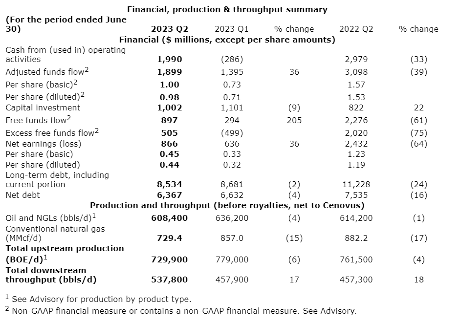 "We achieved significant operational milestones across the company over the quarter," said Jon McKenzie, Cenovus president and chief executive officer. "With all that we have accomplished during the quarter, we're well positioned for the back half of 2023 and beyond."