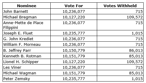 Each of the directors was elected by a majority of the votes cast by the shareholders present or represented by proxy. The results of the vote are detailed below.