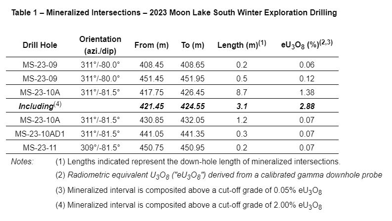 Denison Mines Corp.'s drill hole MS-23-10A intersected 1.38 per cent eU3O8 (equivalent triuranium octoxide) over 8.7 metres (0.05 per cent eU3O8 cut-off), including a subinterval grading 2.88 per cent eU3O8 over 3.1 metres, intersected approximately 30 metres above the unconformity in the Athabasca sandstone, as part of the recently completed winter exploration program at the Moon Lake South property.