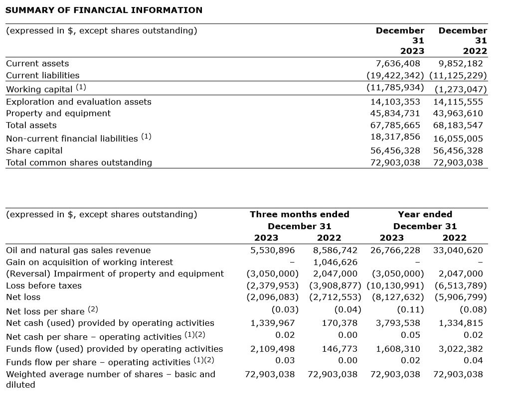 - During Q4 2023, San Martin oil production averaged 424 (net 147) bbl of oil per day and natural gas production from the Las Violetas concession averaged 9,568 (net 3,323) mcf per day and oil production averaged 261 (net 91) bbl of oil per day.