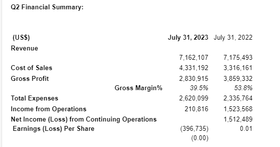 Q2 financial highlights (May 1, 2023, to July 31, 2023):