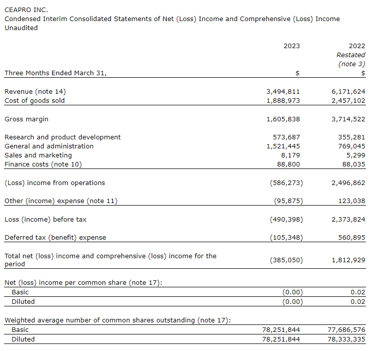 CEAPRO INC. REPORTS FINANCIAL RESULTS FOR FIRST QUARTER 2023 AND PROVIDES CORPORATE UPDATE