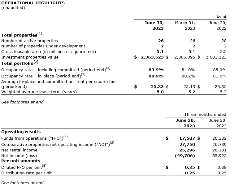 Net income for the quarter: For the three months ended June 30, 2023, the trust generated a net loss of $49.7-million. Included in net loss for the three months ended June 30, 2023, are negative fair value adjustments to investment properties totalling $38.9-million across the portfolio and net loss from the REIT's investment in Dream Industrial Real Estate Investment Trust totalling $33.7-million, primarily due to the sale of 12.5 million units at a price below IFRS (international financial reporting standards) carrying value during the quarter, partially offset by net rental income totalling $25.3-million and positive fair value adjustments to financial instruments totalling $14.7-million, primarily due to the revaluation of the subsidiary redeemable units as a result of a decrease in the trust's unit price.