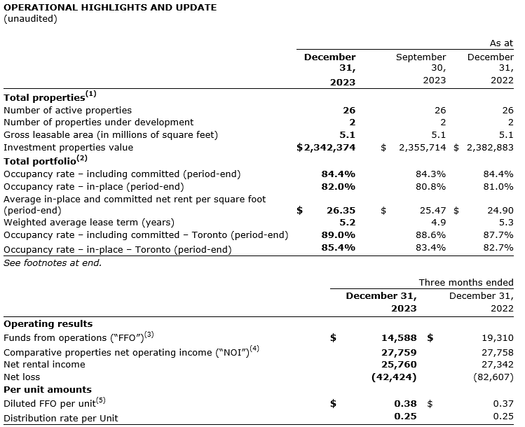 Net loss for the quarter: For the three months ended Dec. 31, 2023, the trust generated a net loss of $42.4-million. Included in net loss for the three months ended Dec. 31, 2023, are negative fair value adjustments to investment properties totalling $28.8-million across the portfolio and negative fair value adjustments to financial instruments totalling $19.3-million primarily due to remeasurements on rate swap contracts due to falling market yield curves and the remeasurement of the carrying value of subsidiary redeemable units as a result of an increase in the trust's unit price over the quarter, partially offset by net rental income totalling $25.8-million.