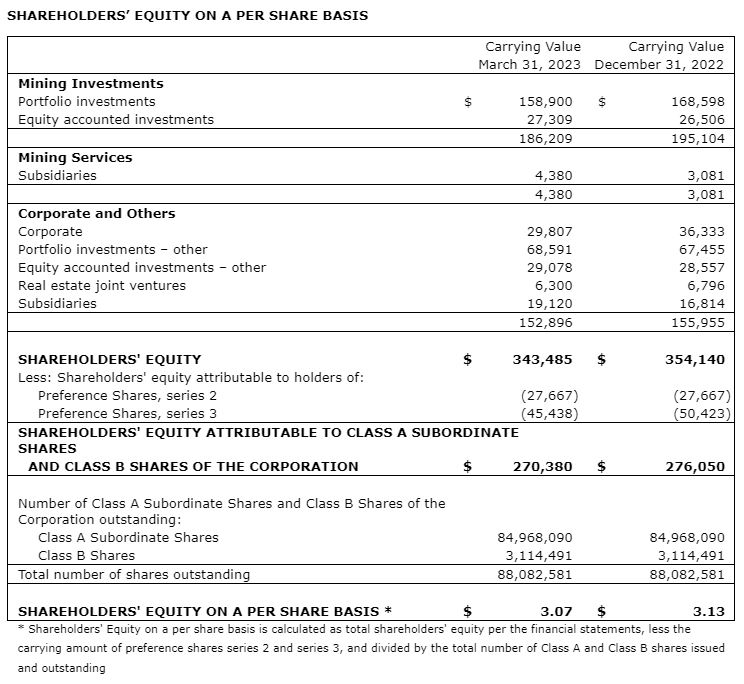 In the first quarter of 2023, the Corporation reported net loss from mining investments of $9.7 million (2022 - earnings of $47.2 million). Performance from the mining investment portfolio contributed $8.7 million to this loss. Share of loss from equity accounted mining investments during the first quarter of 2023 was $1.0 million (2022 - $nil).