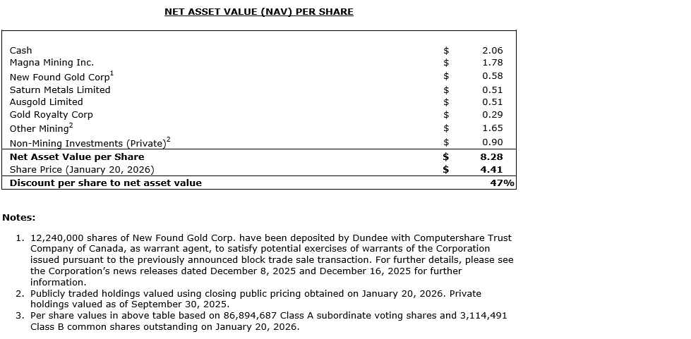 Jonathan Goodman, president and chief executive officer of Dundee, commented: "The closing of the sale of the Borborema royalty represents a disciplined step in our ongoing strategy to crystallize value and redeploy capital into opportunities that we believe can generate sustainable future cash flow for Dundee through mining operations. This transaction was completed with a counterparty that shares our conviction in the long-term value of the underlying asset and it reflects a relationship-driven partnership built around that shared view. With the transaction now closed, we have strengthened our balance sheet further and delivered NAV accretion for shareholders. Based on our updated assessment, highlighted below, the intrinsic value of our portfolio continues to materially exceed our current market capitalization, reinforcing our view that the company remains significantly undervalued. We believe this gap presents a compelling opportunity as we execute on initiatives designed to unlock value and drive long-term returns."
