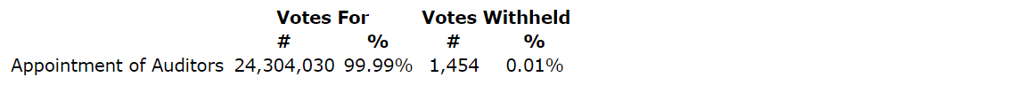 The resolution to appoint PricewaterhouseCoopers LLP as auditor of the corporation, to hold office until the next annual meeting of shareholders of the corporation or until its successor is appointed, and to authorize the directors to fix the auditor's remuneration was adopted on a vote by show of hands by a majority of the votes cast by the shareholders present in person or represented by proxy at the meeting. The votes cast by shareholders present in person or represented by proxy at the meeting for the appointment of the auditor are provided in an attached table.