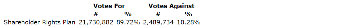 On a vote by ballot, the ordinary resolution to approve and reconfirm the amended and restated shareholder rights plan of the corporation was passed by a majority of greater than 50 per cent of the votes cast by shareholders present in person or represented by proxy at the meeting. The votes cast by shareholders present in person or represented by proxy at the meeting for the shareholder rights plan are provided in an attached table.