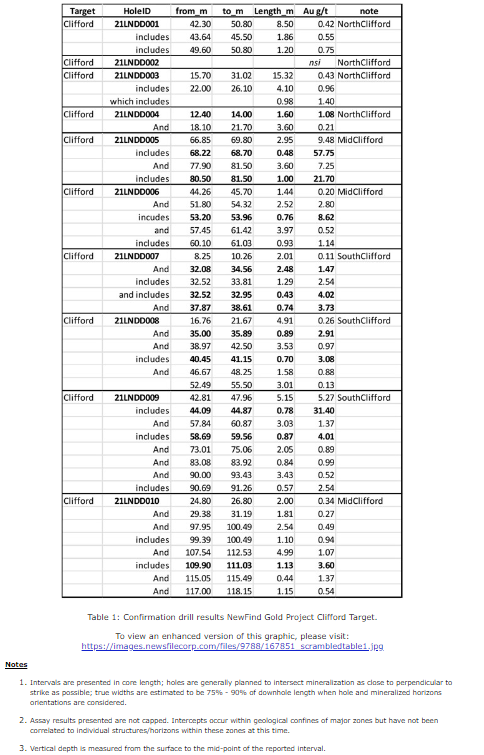 - Mid confirmation drill fence hole 21LNDD005 intersected two anomalous structures, one 2.95 m anomalous interval with 0.48 m of 57.75 grams per tonne gold and another 3.60 m interval hosting one m of 21.70 g/t gold.