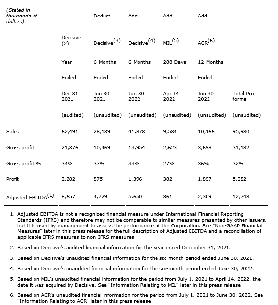 The attached table sets forth the pro forma combined financial information of Decisive after giving effect to the acquisitions completed by it in 2022 (being ACR and Marketing Impact Ltd. (MIL)), for the trailing 12-month period ended June 30, 2022.
