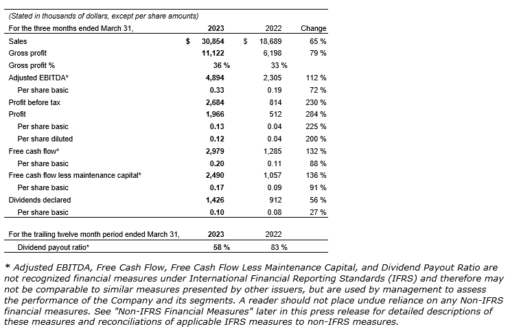 Record quarterly consolidated sales in Q1 2023, which increased 65 per cent to $30.9-million, compared with $18.7-million in Q1 2022;