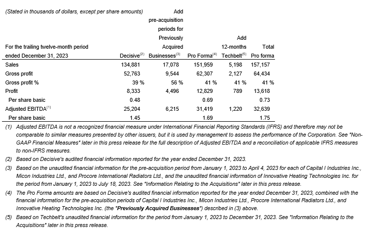 The attached table sets forth the pro forma combined financial information of Decisive, the applicable preacquisition periods for the acquisitions previously completed in 2023 and the acquisition of Techbelt for the trailing 12-month period ended Dec. 31, 2023.