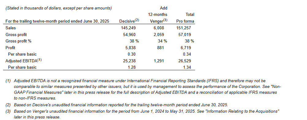 Earnings growth and accretion: expected to be immediately financially accretive to Decisive and represents, on a pro forma basis, an aggregate increase to the corporation's 2025 trailing-12-month sales of 4 per cent and an increase in adjusted EBITDA (earnings before interest, taxes, depreciation and amortization) and adjusted EBITDA per share of 5 per cent.