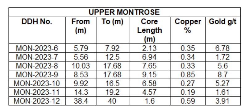 Copper values were also present in holes 6 through 12, averaging 0.12% and ranging from 0.5 ppm to as high as 2.1% in MON-2023-09.