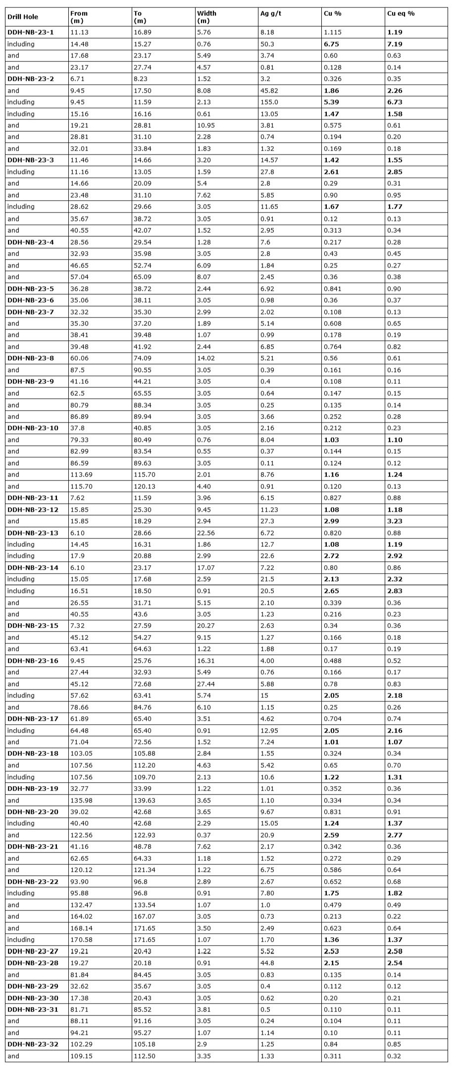- 6.73 per cent Cu equivalent (5.39 per cent Cu and 155 g/t Ag) intersected over 2.13 m in DDH-NB-23-2;