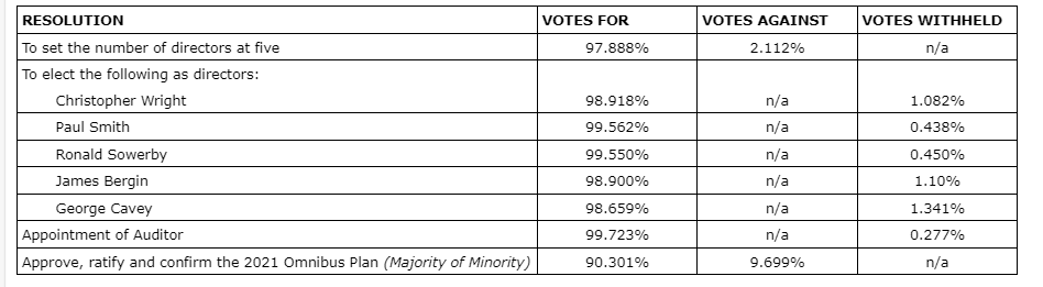 A total of 70,937,959 common shares of the company were voted at the meeting, representing approximately 30.929 per cent of the issued and outstanding common shares of the company.
