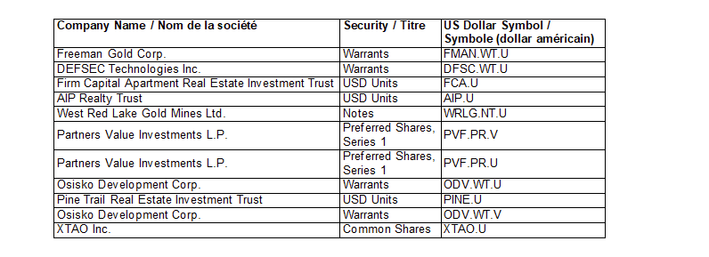 Further to the Toronto Stock Exchange staff notice No. 2024-0005 dated May 27, 2024, all trades on Friday, Jan. 16, 2026, in the securities referred to in the attached table, which trade in U.S. dollars, will be for special settlement on Tuesday, Jan. 20, 2026.