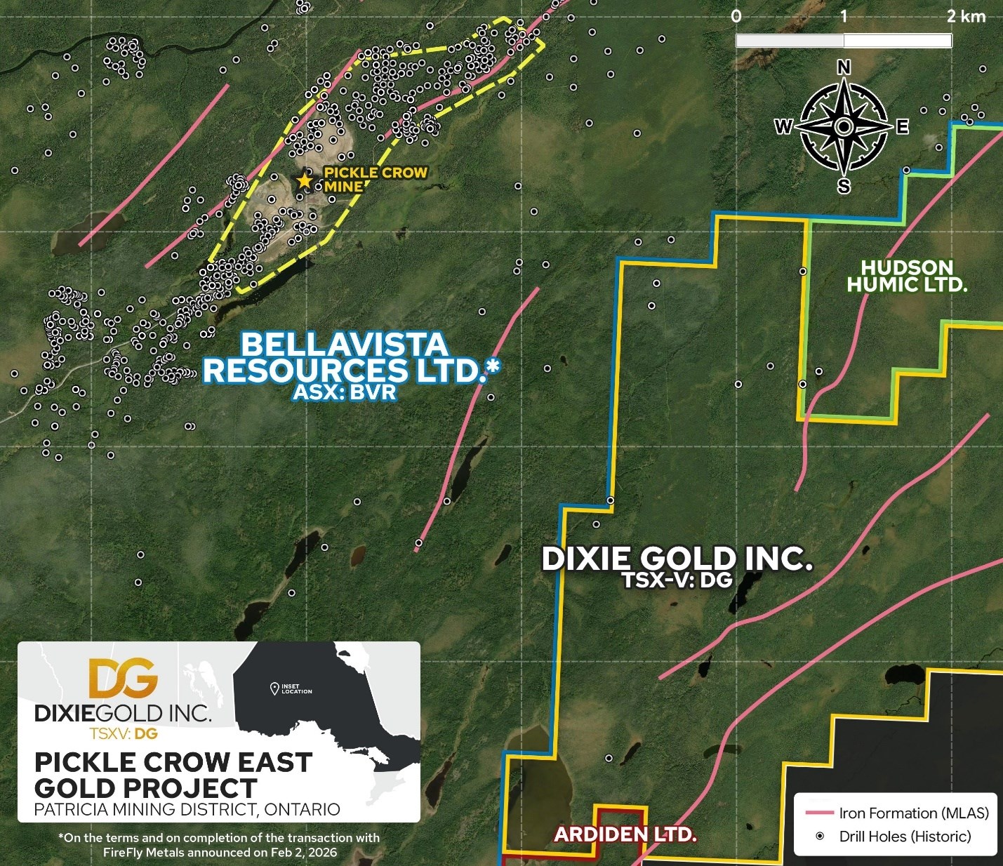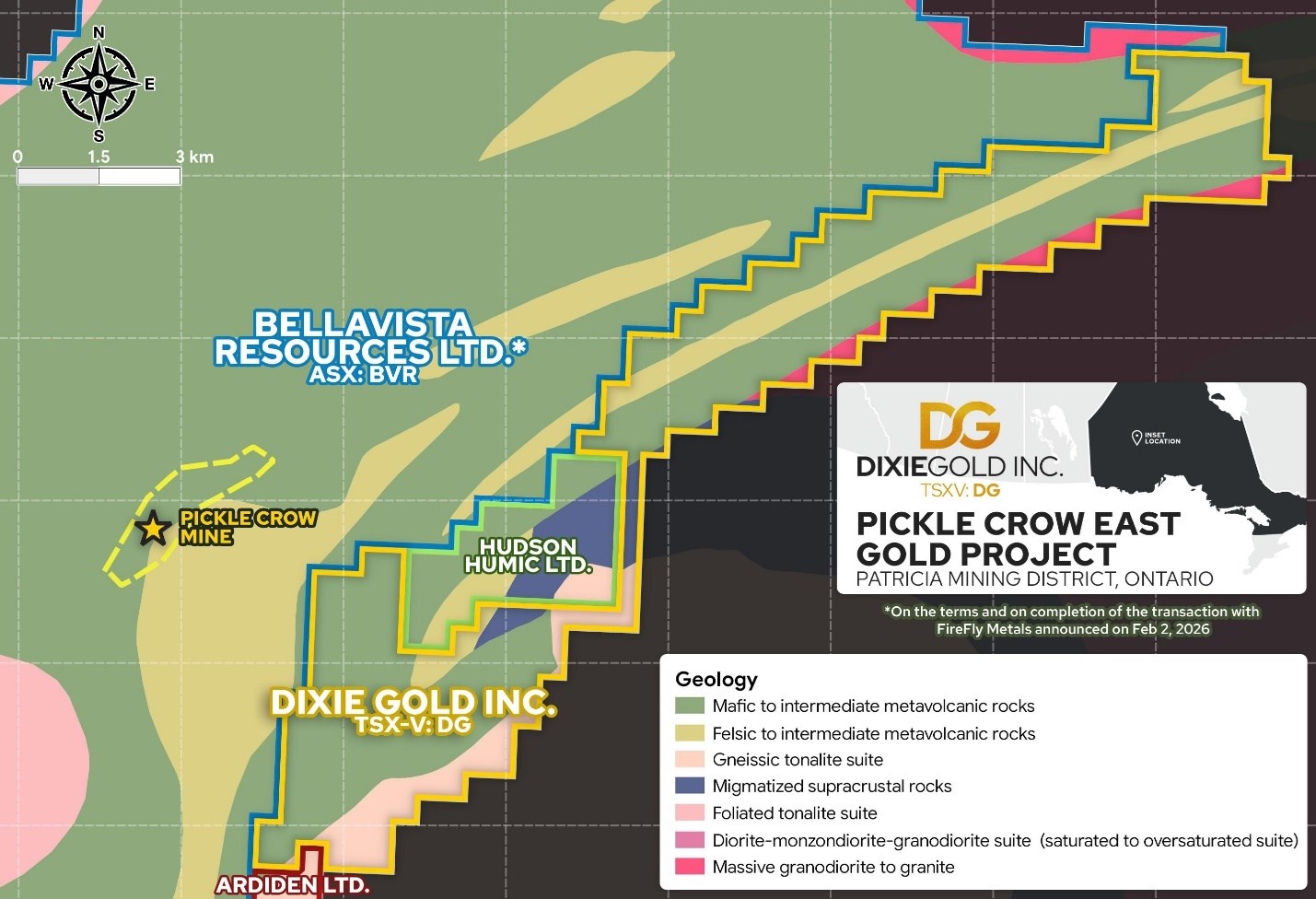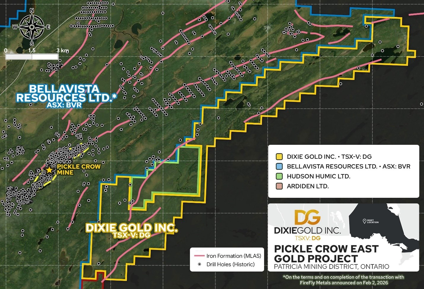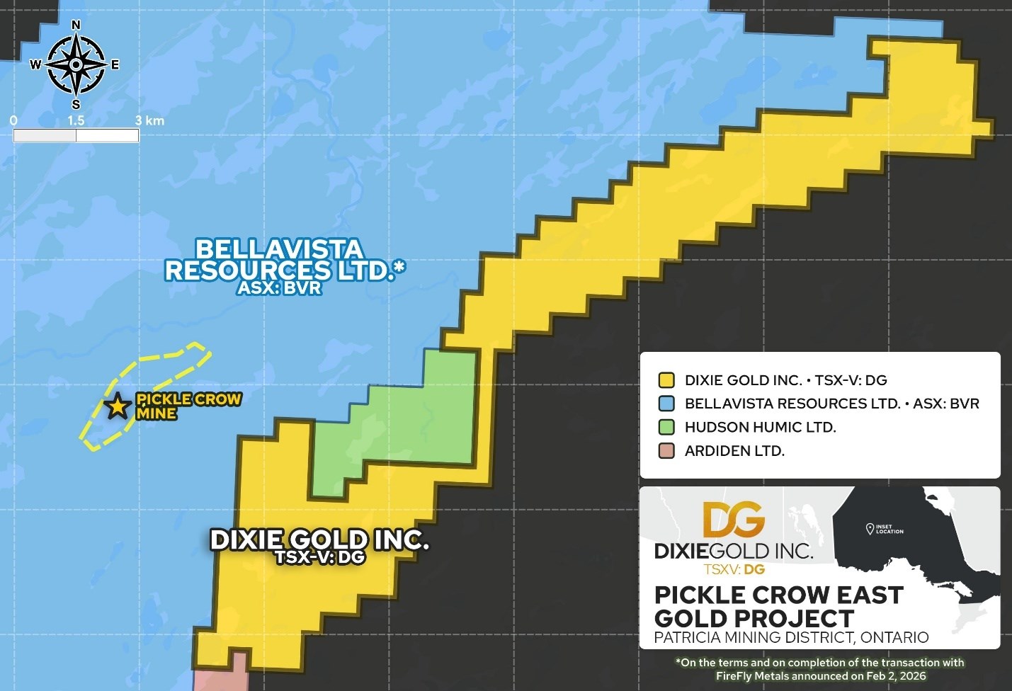 Reminiscent of the Issuer's early move near the Great Bear Project, and given recent corporate activity and exploration results near the historic Pickle Crow gold mine (the "Pickle Crow Mine Project")(see announcements by TSX/ASX-listed FireFly Metals Ltd and ASX-listed Bellavista Resources Ltd and see FireFly Metals Ltd news release, 'FireFly to unlock value from Pickle Crow Gold Project by sale for up to A$86.1M', dated February 1, 2026), Dixie Gold has quickly secured a prominent adjoining project, much of which was, until recently, otherwise locked-up by Commander Resources Ltd. through segments of their then-named First Loon Gold Project. As a result of insufficient exploration assessment credits available to the prior project proponent, additional area was successfully acquired by Dixie Gold when it reopened on February 9, 2026. Those management-led efforts were further complimented on that same day (once the strategic reopening had occurred) by an incremental on-trend regional position, as well as targeted mining claims staked on February 10, 2026.