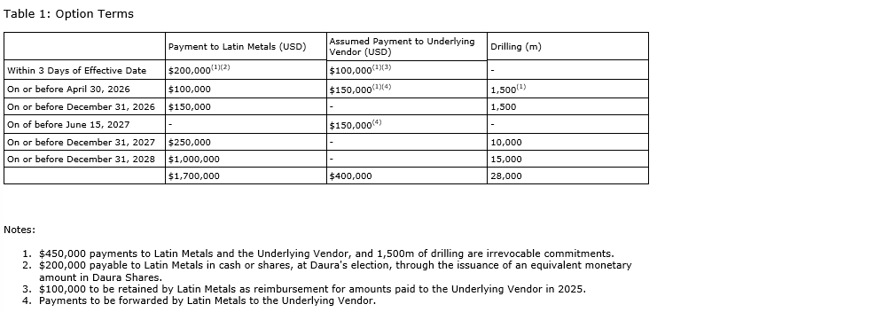 To exercise the option, Daura must make aggregate payments of $1.7-million (U.S.) to Latin Metals, assume payments of $400,000 (U.S.) to the underlying vendor (as defined below), complete exploration work commitments, and prepare and deliver to Latin Metals a report prepared in accordance with Form 43-101F1 on the properties, addressed to Latin Metals and containing a mineral resource estimate on the projects.