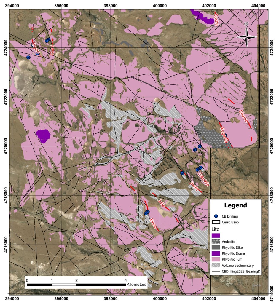 Figure 1: Geological map of the Cerro Bayo Project are with locations of planned first phase of drilling.