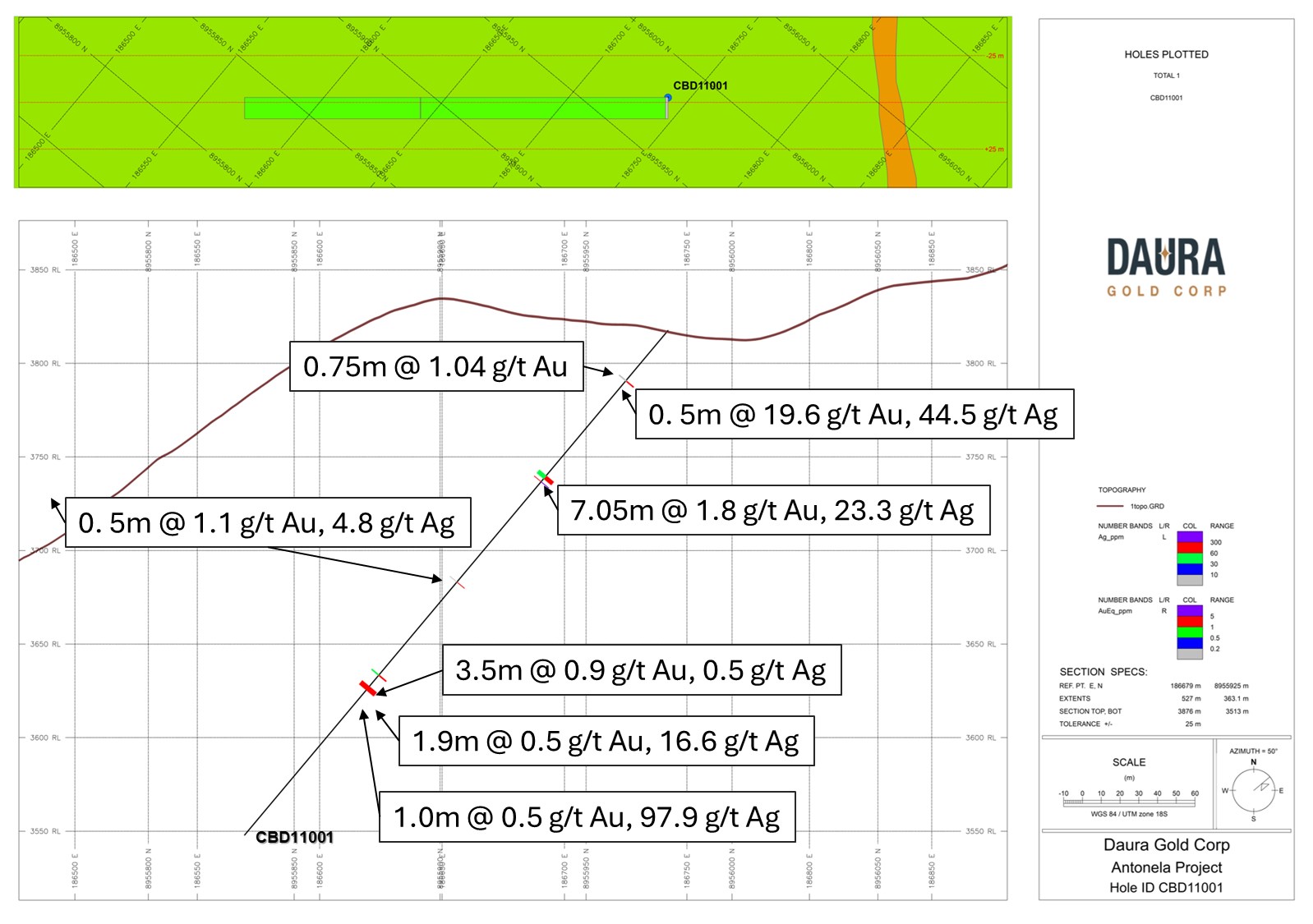Mark Sumner, CEO of Daura, commented, "The systematic infill sampling of historic drill core has significantly increased the previously reported gold and silver intervals at Antonella, revealing wide intercepts across multiple holes and identifying high grade vein mineralization in 9 of 12 drill holes. This new data underpins the potential of the Antonella project, as well as the quality of Daura's technical team by recognizing and executing on the opportunity to enhance our drilling dataset."