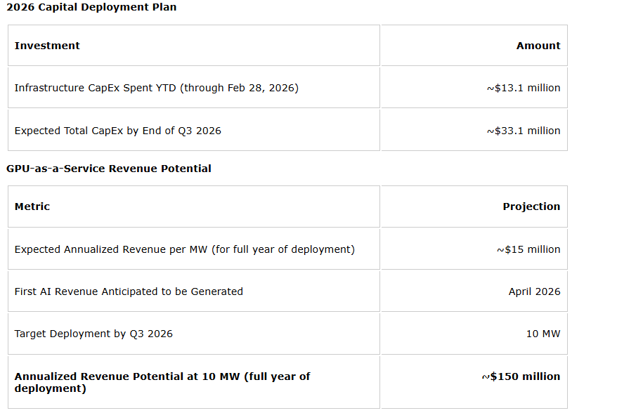 The company believes it current liquidity positions it to be able to carry out the rollout of its 2026 AI infrastructure development plan, which includes the planned deployment of high-efficiency Tier 3 AI data centres and expansion of the company's power capacity across multiple U.S. sites. The company has invested approximately $13.1-million in infrastructure asset purchases year to date, with an additional approximately $20-million forecasted by the end of Q3 2026, to continue its infrastructure expansion and launch its GPU-as-a-service vertical.