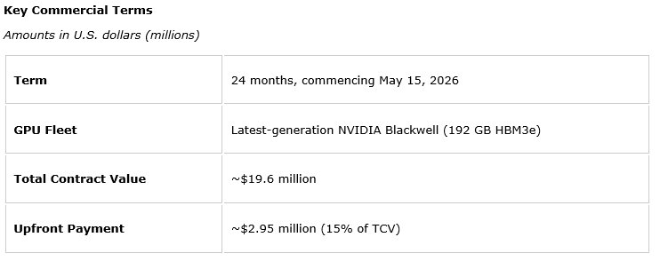 Digi Power X Inc. has entered into a bare metal GPU rental agreement with SubQ AI, a next-generation artificial intelligence company. The 24-month contract carries an expected total contract value of approximately $19.6-million and becomes effective May 15, 2026.