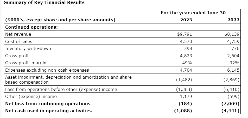 - Net revenue: The company reported total net revenue of $9,791,000 in fiscal 2023 compared with $8,139,000 in the 12 months ended June 30, 2022 (fiscal 2022), from continued operations. This 20-per-cent increase in net revenue is driven by higher net sales in the United States.