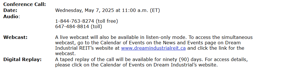 DREAM INDUSTRIAL REIT Q1 2025 FINANCIAL RESULTS RELEASE DATE, WEBCAST AND CONFERENCE CALL