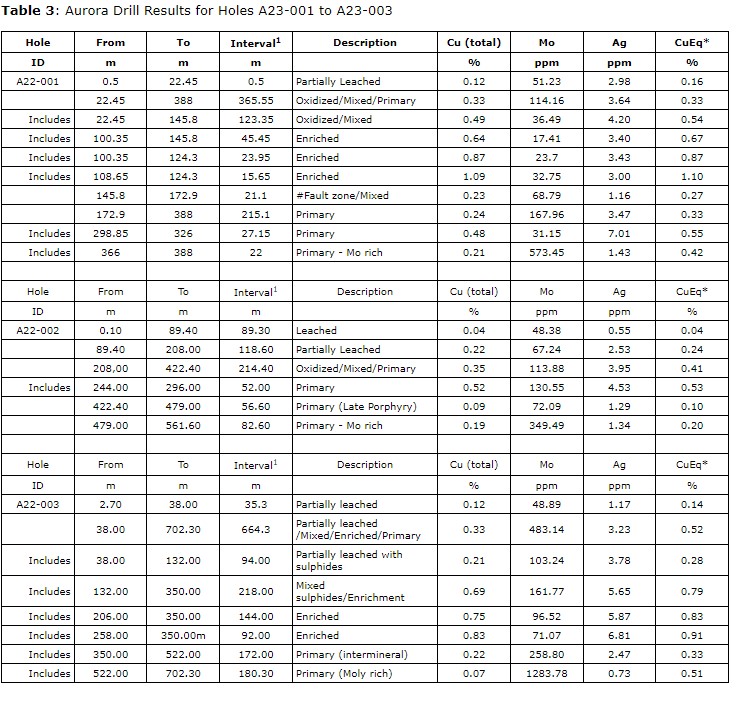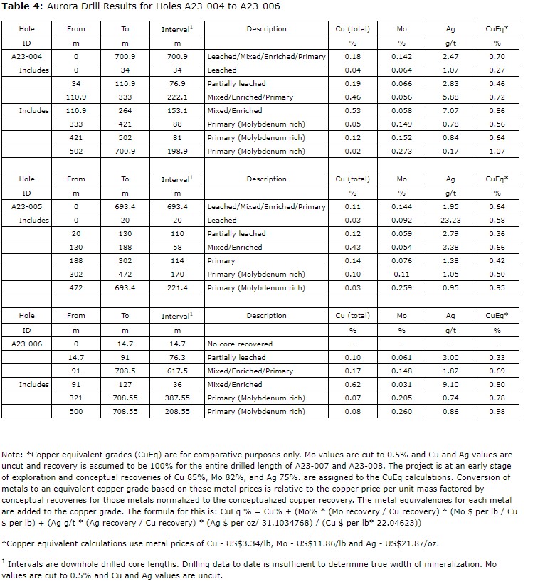 Ian Gendall, president and chief executive officer, commented: "A23-007 was drilled on a stepout of 237 m from A23-006 to define the western boundary of the porphyry Cu-Mo mineralization. This hole has now confirmed we have an east-west molybdenum-copper-silver mineralized zone of at least 685 m. The eastern limit is still open. We continue to intersect very encouraging copper-molybdenum mineralization at Aurora and the downdip extension is open, as are the northern, southern and eastern extents. Drilling of A23-009 is now ongoing on a large stepout of approximately 868 m to the southeast of A23-007 and we have, as expected, cut a mineralized porphyry, in A23-009 at 12.90 m. Assay results for A23-009 which ended at 790.55 m are awaited and we are very encouraged with early mineralized porphyry intersections observed in A23-009."