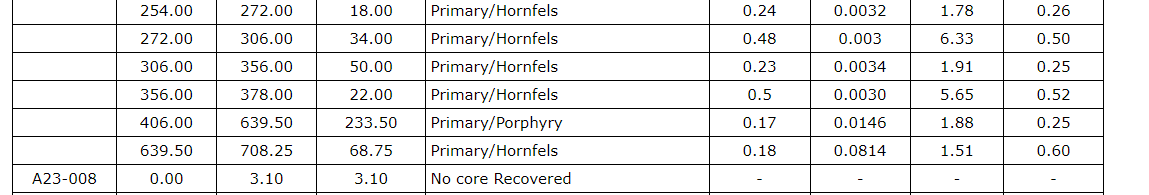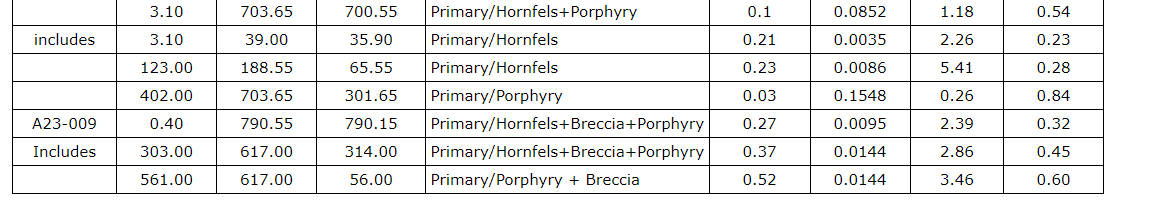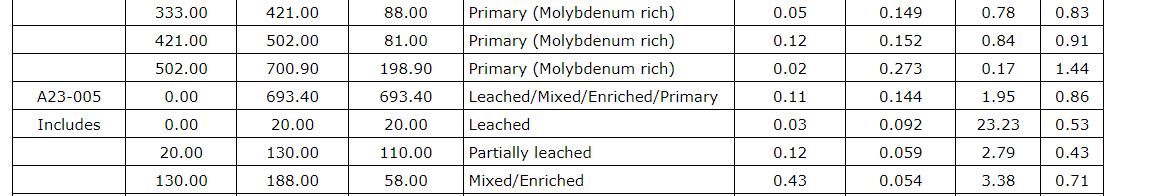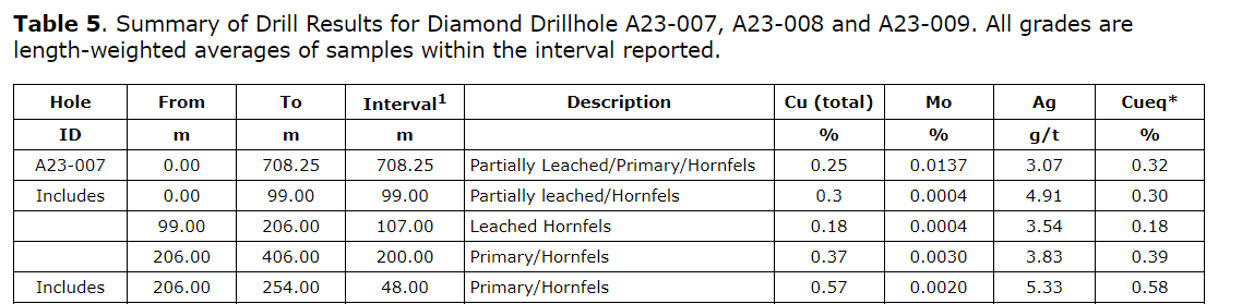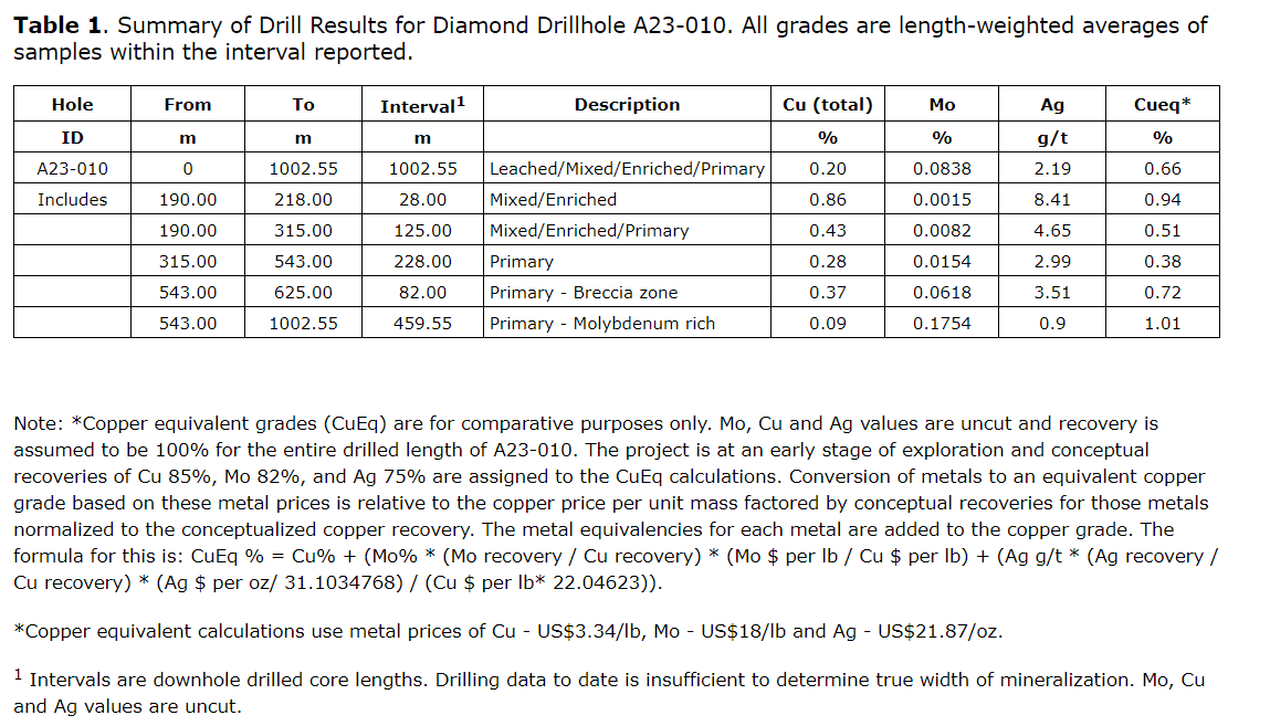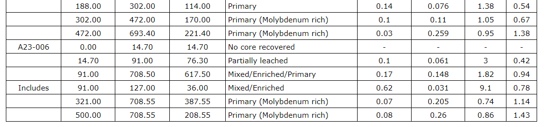 Drill hole A23-010 was drilled approximately 55 metres east of drill hole A23-009 and intersected significant copper and molybdenum mineralization throughout the hole to a depth of 1,002.55 m. A23-010 ended in molybdenum mineralization, and the most significant mineralized intervals included: