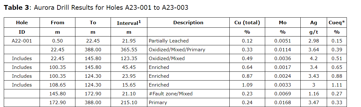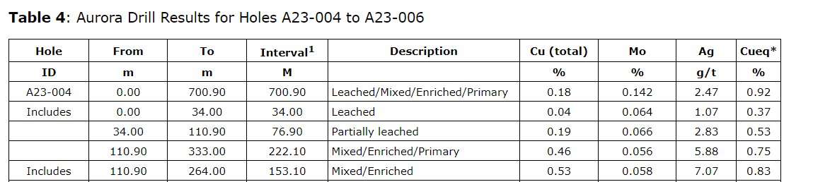 Aurora Cu-Mo project -- summary of drill results for A23-010