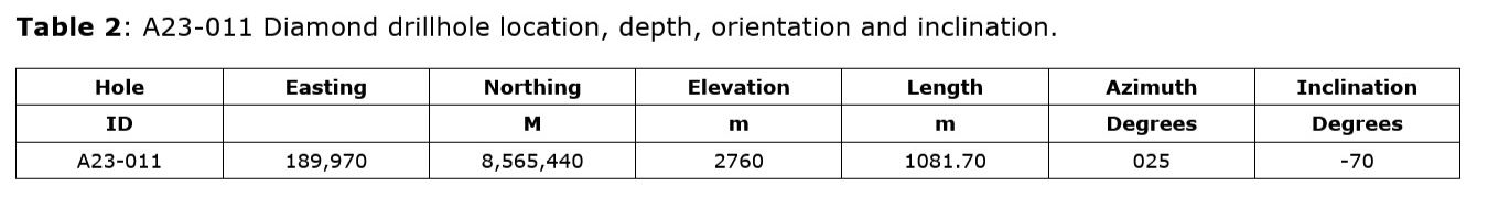 Drillhole A23-011 (Figures 2, 3 and 4) commenced on August 16, 2023 and was completed on September 16, 2023 at a depth of 1081.70m. The drillhole was drilled on an azimuth of 025 degrees with a dip of -70 degrees. Coordinates are 8,565,440mN and 189,970mE at an elevation of 2760m.0 - 3.10m: Overburden, no core recovered.3.10 - 192.15m: Hornfels with minor chalcopyrite with molybdenite. Upper 110m is partially leached.192.15 - 297.70m: Quartz-eye-feldspar-biotite porphyry (QEFBP) with moderate to strong intermediate argillic alteration and quartz-sericite alteration overprint of weak secondary biotite alteration. Mineralization includes minor amounts of disseminated chalcopyrite with trace chalcocite and covellite, moderate amounts of pyrite and trace molybdenite. Fault zone on lower contact.297.70 - 524.00m: QEFBP with moderate secondary biotite alteration and minor fluorite with moderate chalcopyrite-pyrite mineralization and minor molybdenite.524.00 - 704.70: QEFBP with moderate quartz-sericite alteration overprint on potassically altered porphyry. Minor chalcopyrite-pyrite mineralization with moderate molybdenite mineralization. 704.70 - 1081.70m: QEFBP and quartz-feldspar porphyry (QFP) with moderate to strong coarse graine muscovite and K-feldspar alteration and weak intermediate argillic overprint. Mineralization includes moderate disseminated pyrite, minor chalcopyrite with intense molybdenite both disseminated and in quartz veinlets. The hole ended in molybdenite mineralization.