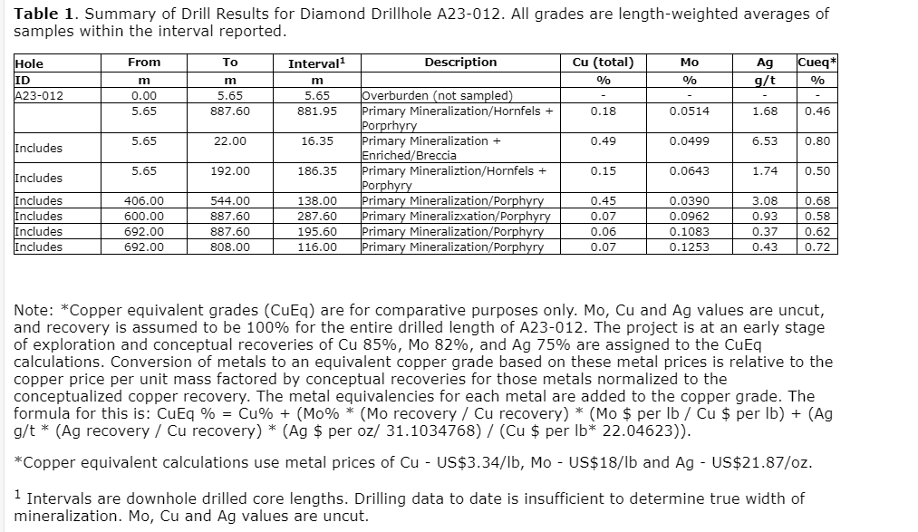 Aurora Cu-Mo project -- summary of drill results for A23-012: