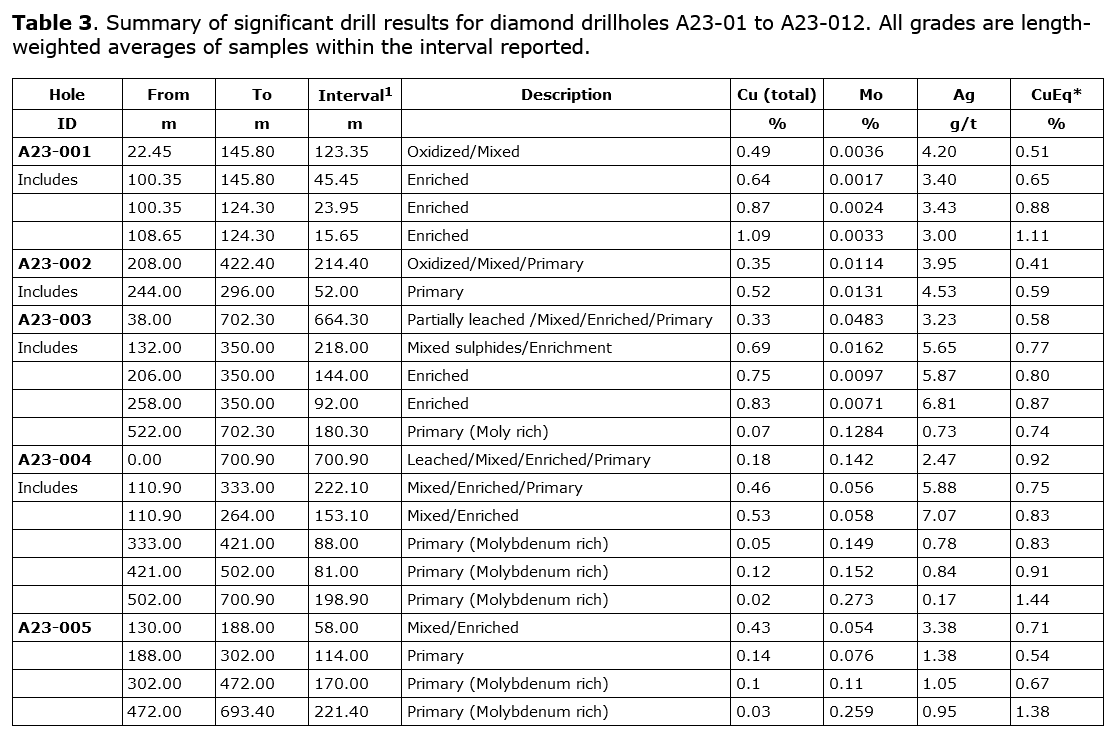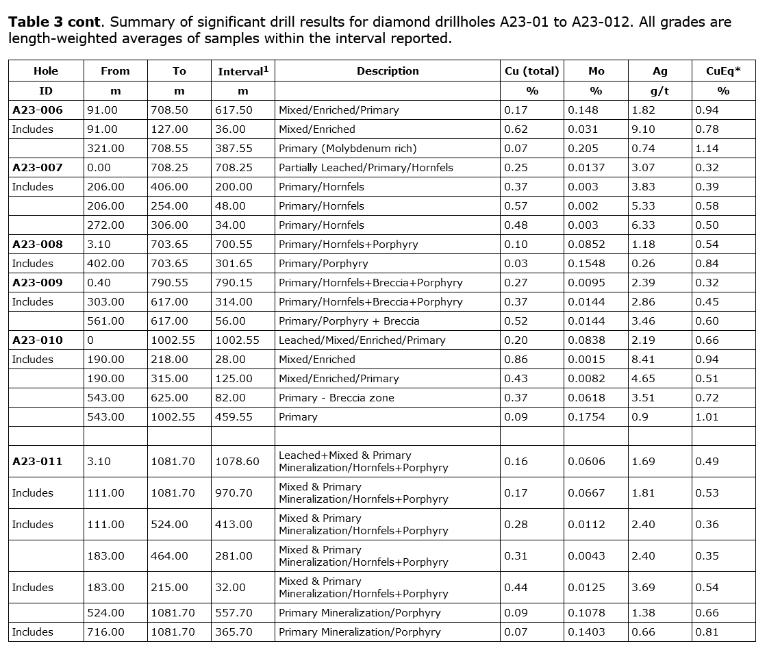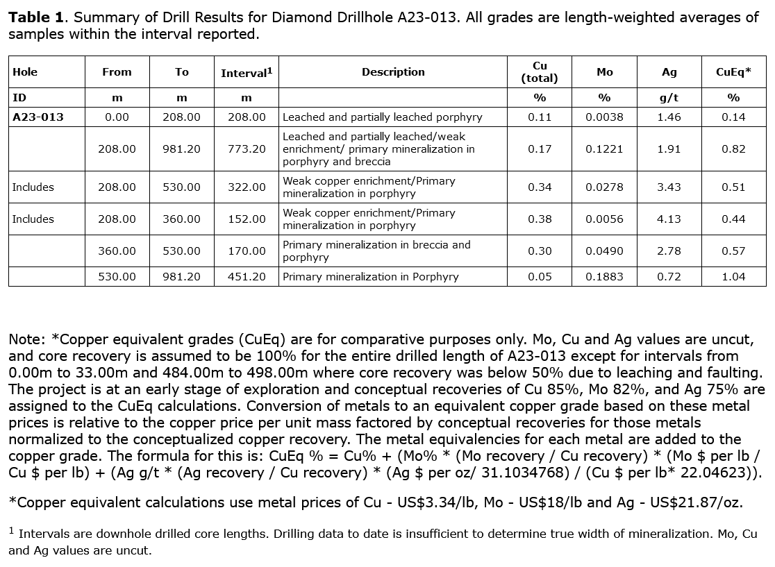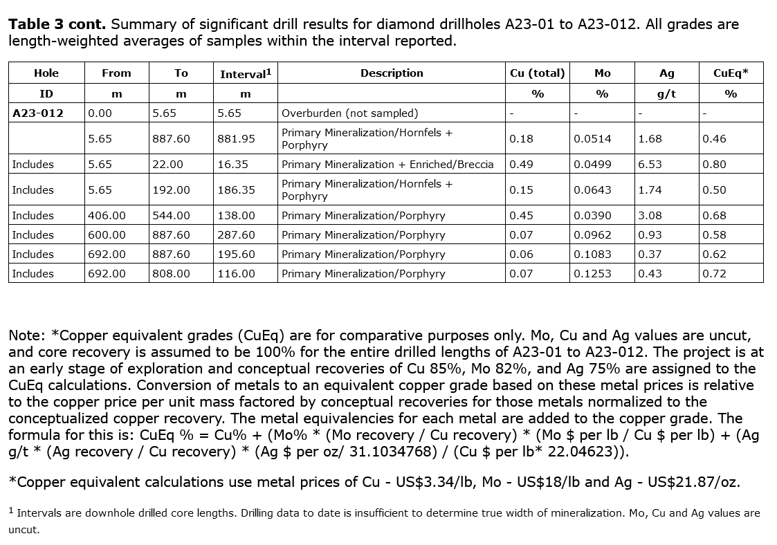 - Drill hole A23-013 was drilled approximately 515 metres northwest of drill hole A23-012 and intersected significant copper and molybdenum mineralization throughout the hole to a depth of 981.20 metres. A23-013 ended in molybdenum mineralization and the most significant mineralized intervals included: