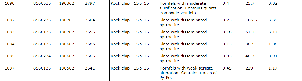 See an attached table for the full set of results for the rock chip samples.