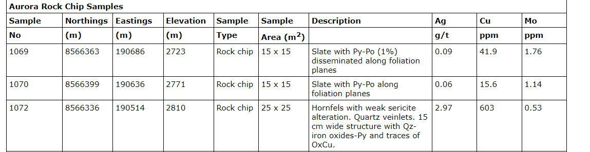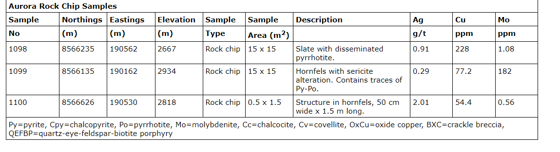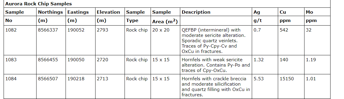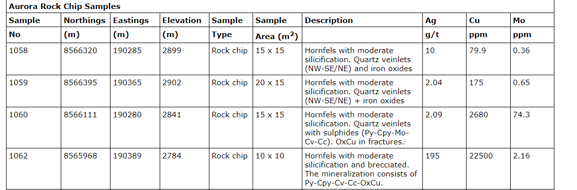 - Further rock chip samples with highly anomalous Cu, Ag and/or molybdenum results included: