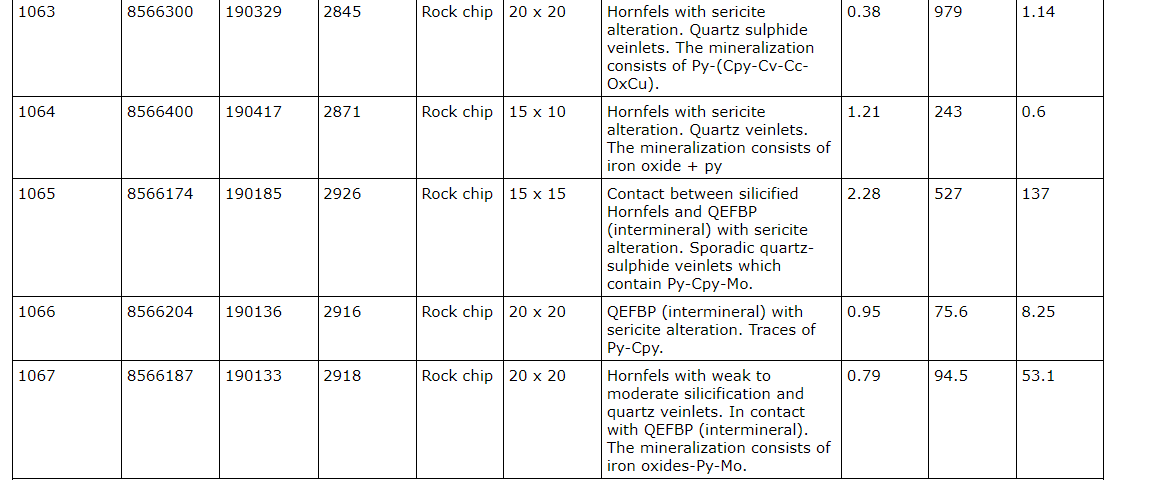 - Rock chip sample 1062 returned 2.25 per cent copper and 195 grams per tonne silver. This sample was taken from a moderately silicified and brecciated hornfels with mineralization consisting of pyrite-chalcopyrite-covellite-chalcocite and copper oxides. Sampling was done over a surface area of 10 m by 10 m.
