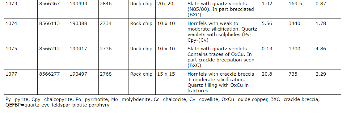 - Sample 1075 -- 0.1300 per cent Cu, 0.13 g/t Ag and 4.86 ppm Mo;