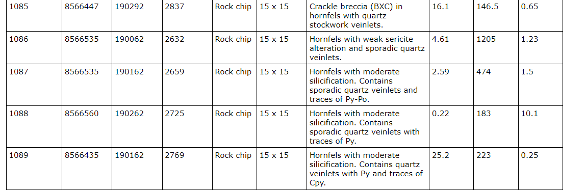 - Sample 1084 -- 1.5150 per cent Cu, 5.53 grams per tonne Ag and 1.01 parts per million Mo;