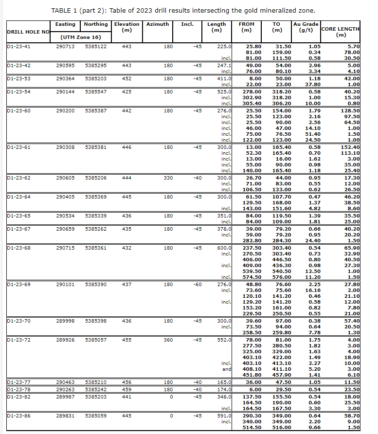 The objective of this exploration program was to follow up on Delta's discovery drill holes released in October, 2022, and January, 2023, including D1-22-18: 5.92 grams per tonne Au over 31 metres, including 14.8 g/t Au over 11.9 metres; D1-22-24: 6.49 g/t Au over 10 metres; and D1-22-25: 130 g/t Au over one metre, 1.2 g/t Au over 20 metres and 1.66 g/t Au over 18.1 metres.