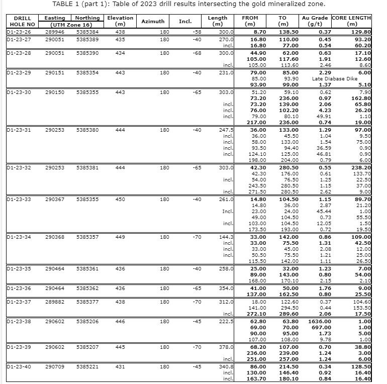 East extension: East of the main gold mineralized zone, Delta has traced low-grade gold mineralization over a strike length greater than 600 metres, at shallow depths, with widely spaced drilling including D1-23-45: 0.63 g/t Au over 12.5 metres; D1-23-47: 0.30 g/t Au over 36.5 metres; D1-23-48: 0.30 g/t Au over 48.7 metres; D1-23-74: 0.49 g/t Au over 15.5 metres. These intercepts are believed to be part of gold-enriched halo of a higher-grade core that will be explored in future drilling.