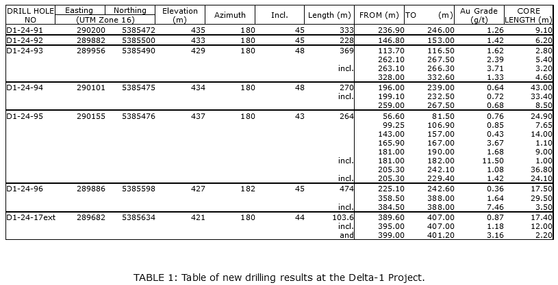 Andre Tessier, President and CEO, commented: "We continue to be impressed with our drill results at Delta-1. So far, in 2024, with each new drill hole, we are adding to our gold inventory at Delta 1. The gold zones continue to show widths, continuity, and homogeneity near surface, adding to the potential for an open-pit operation; while higher grade intercepts of 7.46 g/t gold over 3.5 metres and 3.16 g/t gold over 2.2 metres suggest underground potential at depth. The drill program is still underway, and we look forward to more results shortly."
