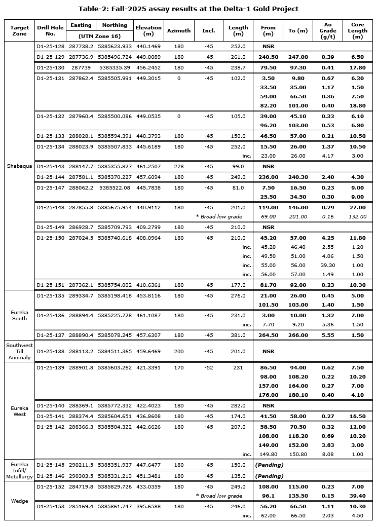 Ron Kopas, chief executive officer (interim) of Delta, commented: "The discovery of a potential new gold zone at Nova target in the Wedge area highlights the exceptional upside for additional significant discoveries across our extensive Delta-1 property. This is particularly encouraging given our success at the Shabaqua target (see Delta's Jan. 12, 2026, press release), where autumn drilling returned 4.25 grams over 11.8 metres. As we continue to advance the Eureka gold deposit through infill and metallurgical work, we believe the ongoing discoveries of additional gold sources on the Delta-1 property, that could be developed synergistically with the Eureka deposit, continue to strengthen the project economics in this low-cost jurisdiction. This opportunity is further strengthened by our strategic location just 50 kilometres from Thunder Bay, which is an established hub for mining operations in Northern Ontario, where we are seeing increasing positive results from neighbouring projects (see recent Gold X2 press release).